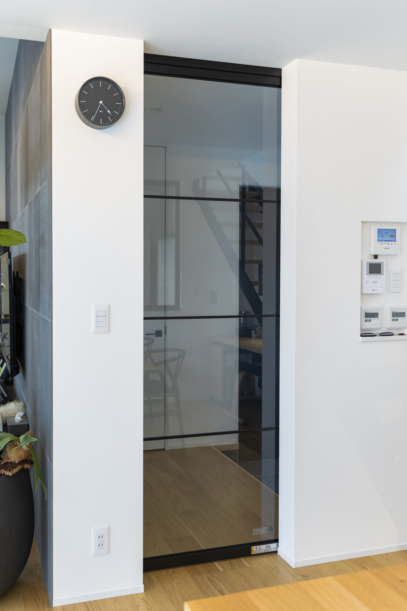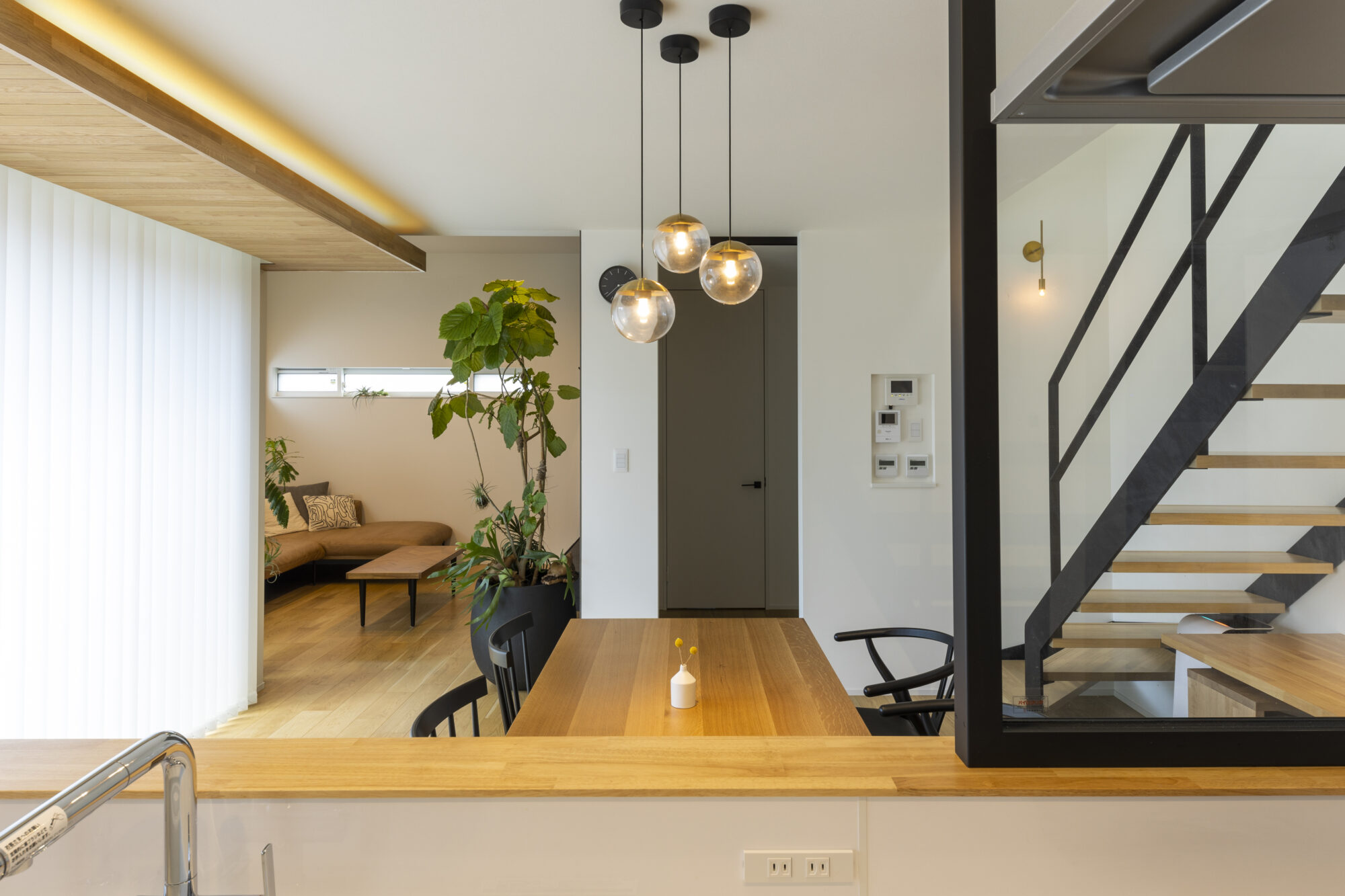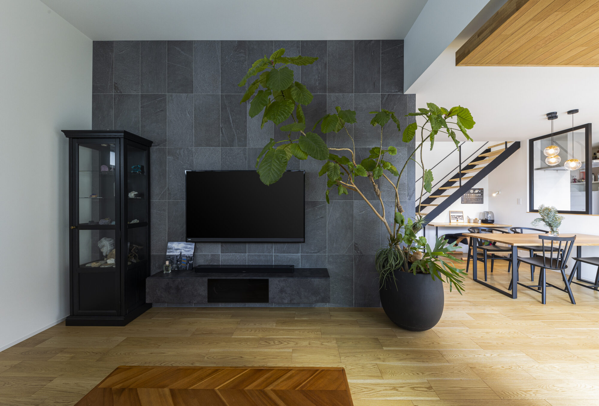 黒と木目、白を基調とした直線的なインテリアは、余計なものを削ぎ落としながらも落ち着いた雰囲気を漂わせ、そこに配した大きな観葉植物が、静けさに生命の息吹を添えています。