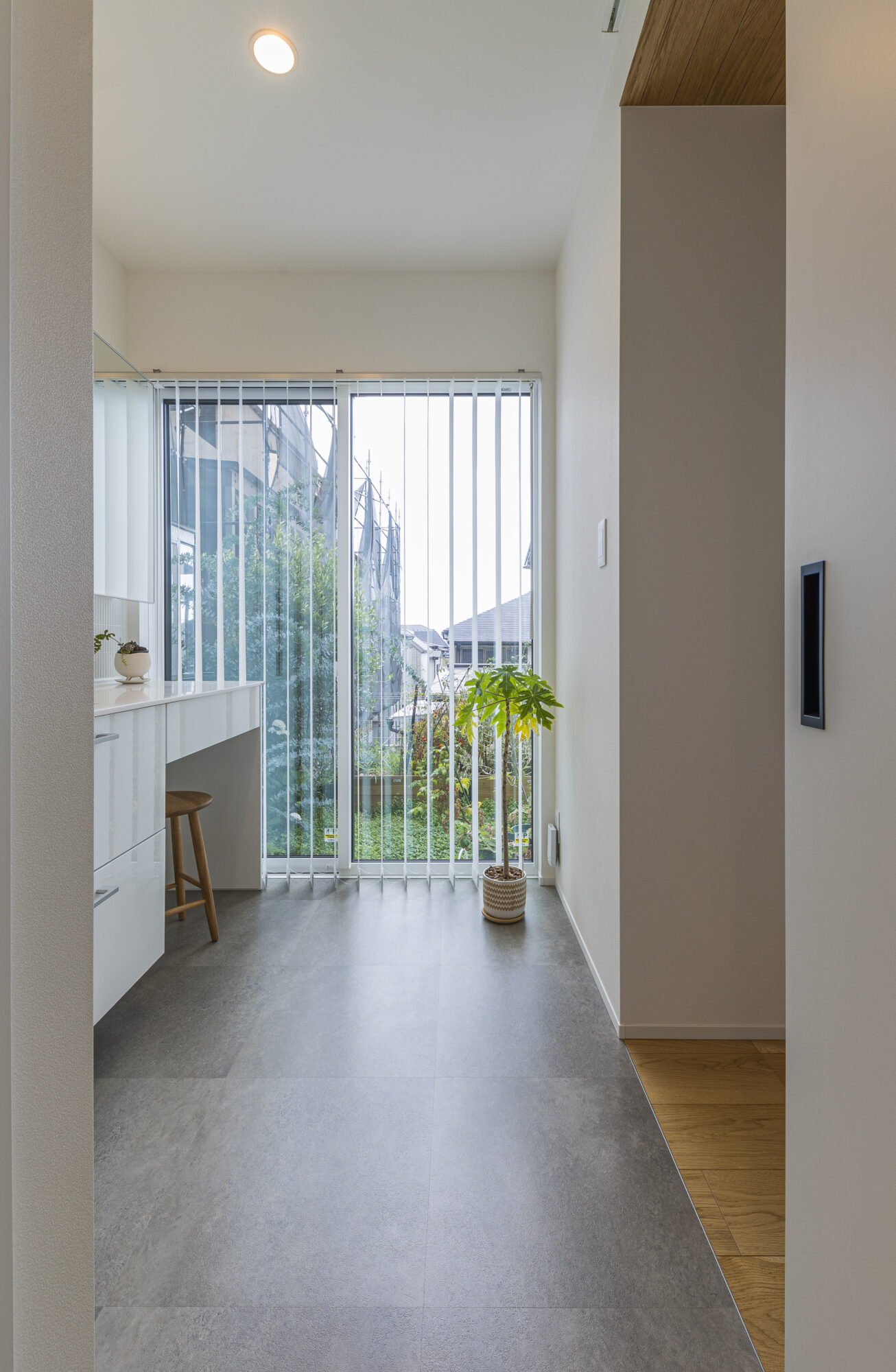 玄関を抜けると、大開口の窓が庭と室内をひとつにつなぎ、四季折々の光や風が暮らしの中心へと流れ込みます。
