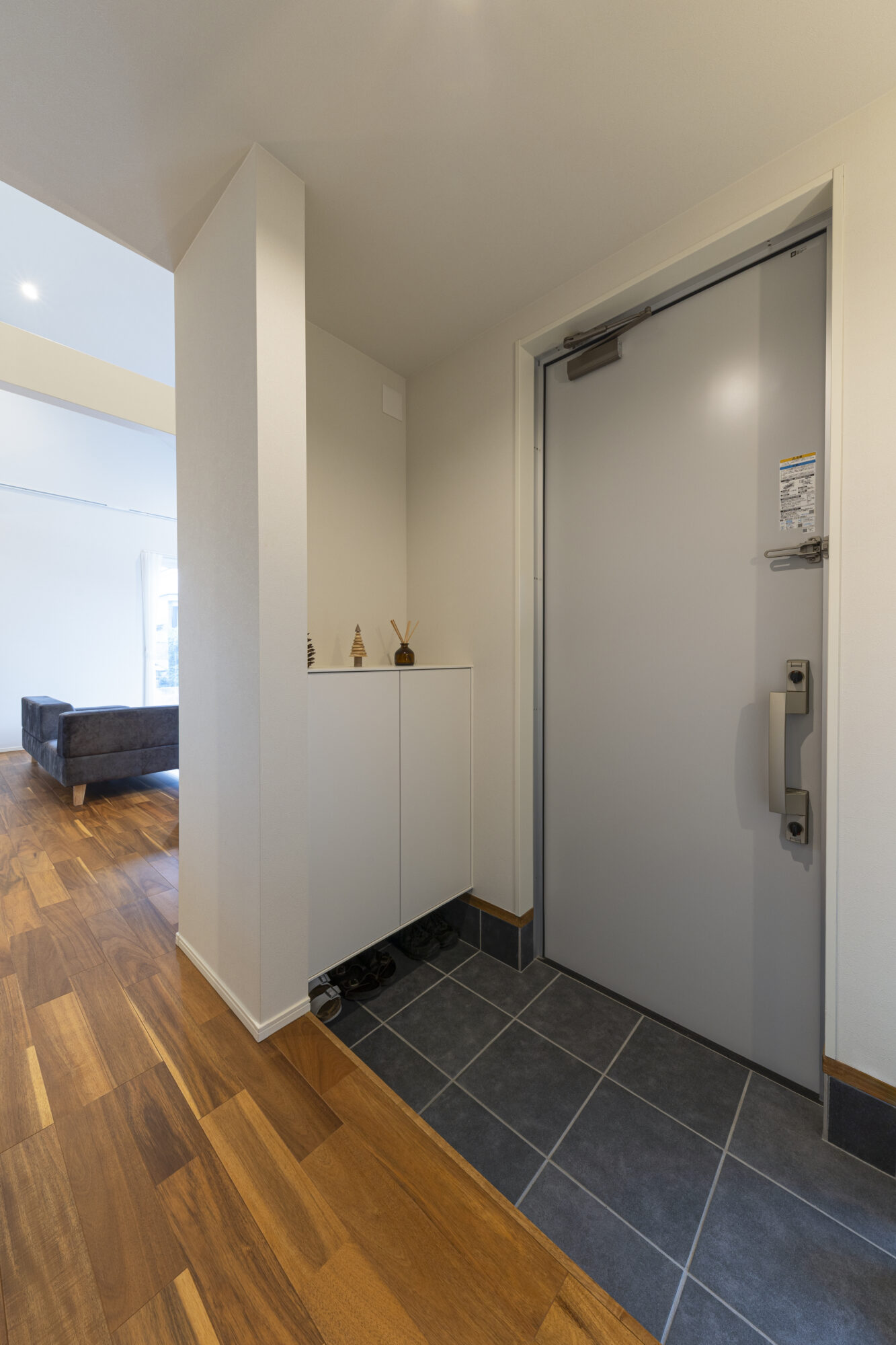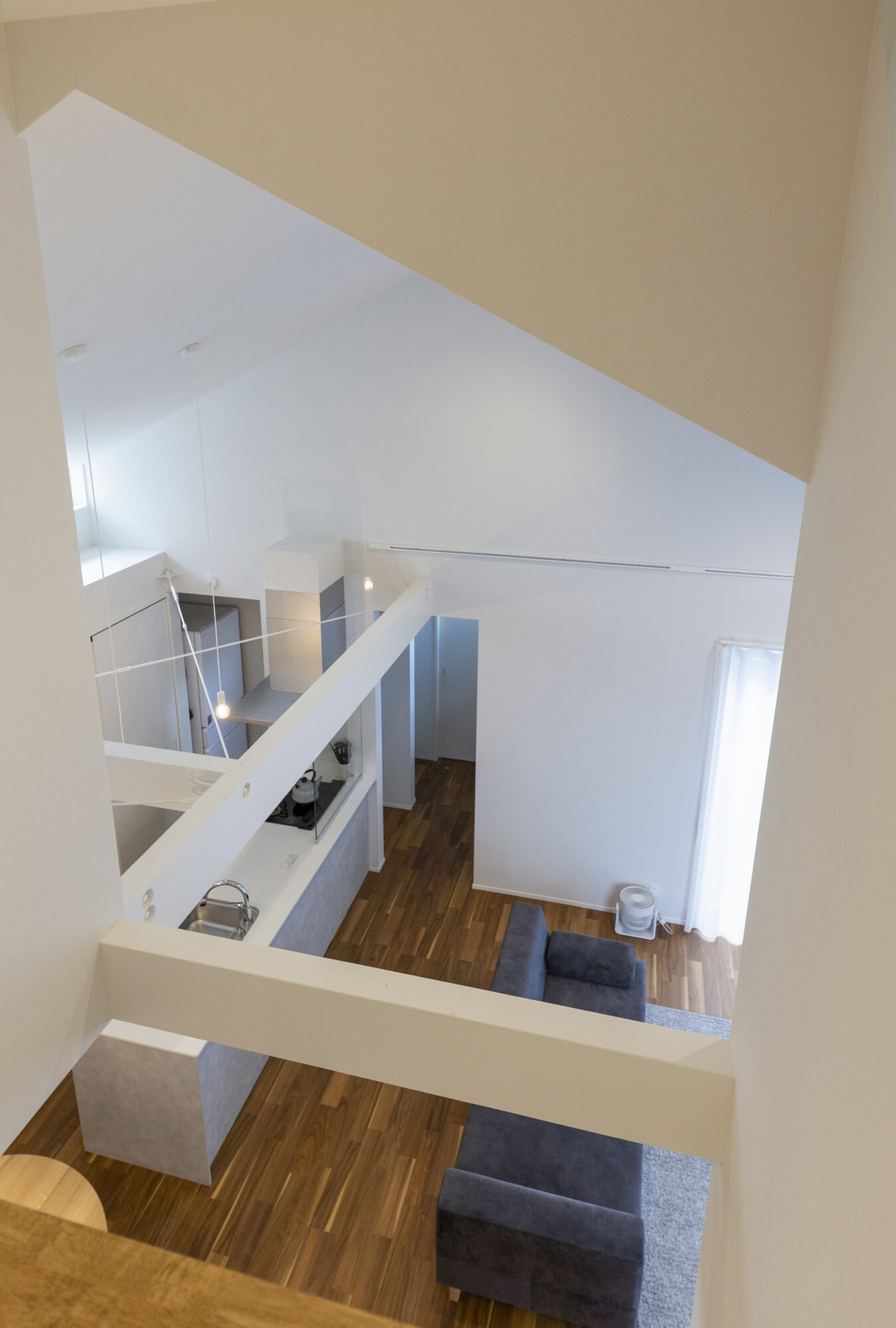 空間に奥行きと流れを持たせることで、見る位置によって印象が変わる立体的な住まいに仕上げています。