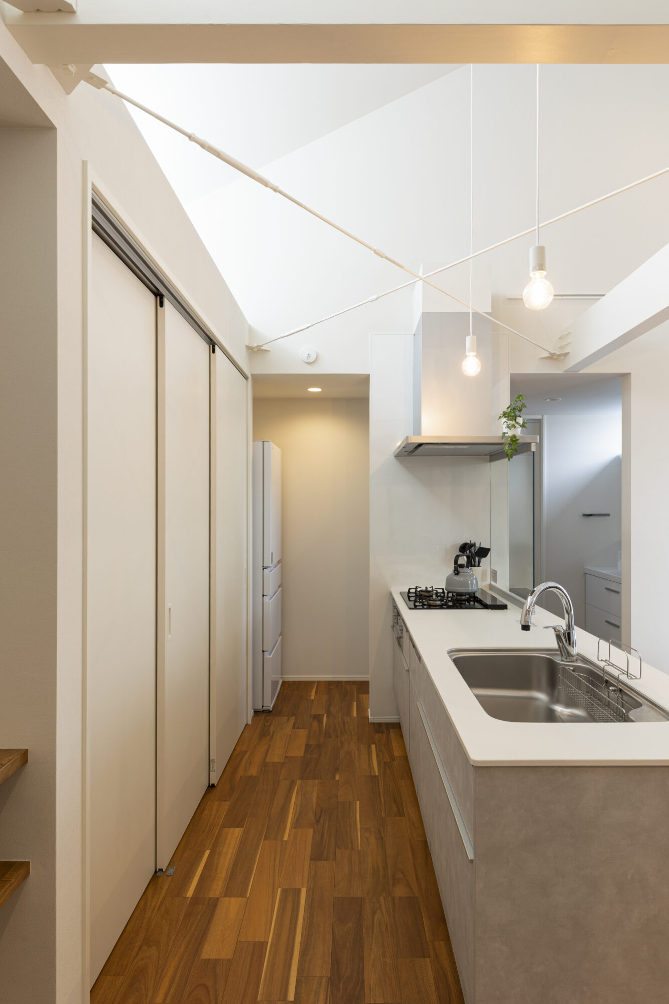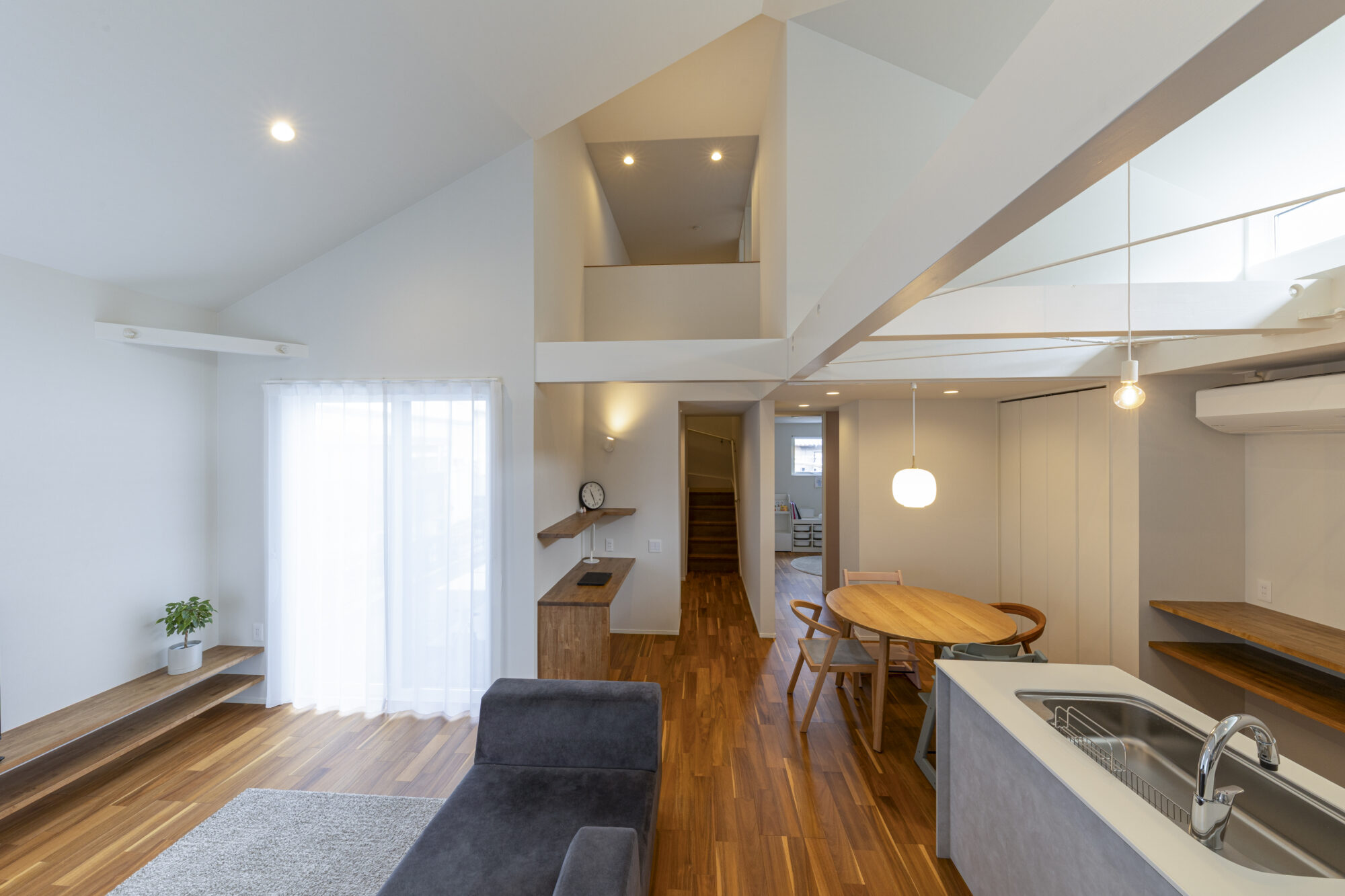 LDKは2層分の吹抜けを活かした勾配天井とし、家族が集っても開放感のある大空間に。