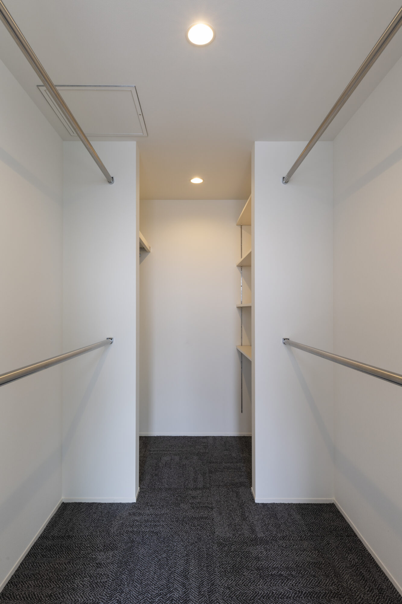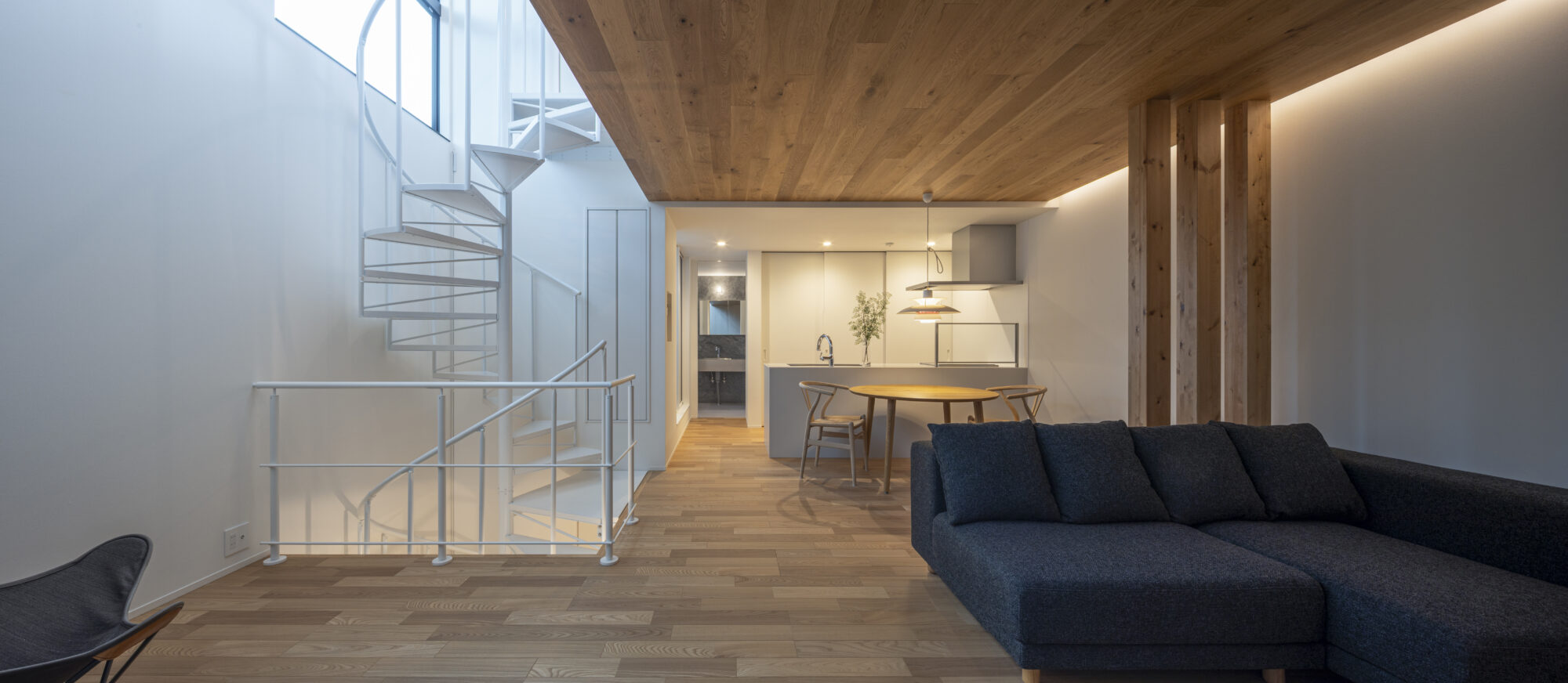 住まいの中央に据えた螺旋階段は、ぐるぐると回りながら各階をつなぎ、家族の気配を伝える縦方向の広がりを生み出します。